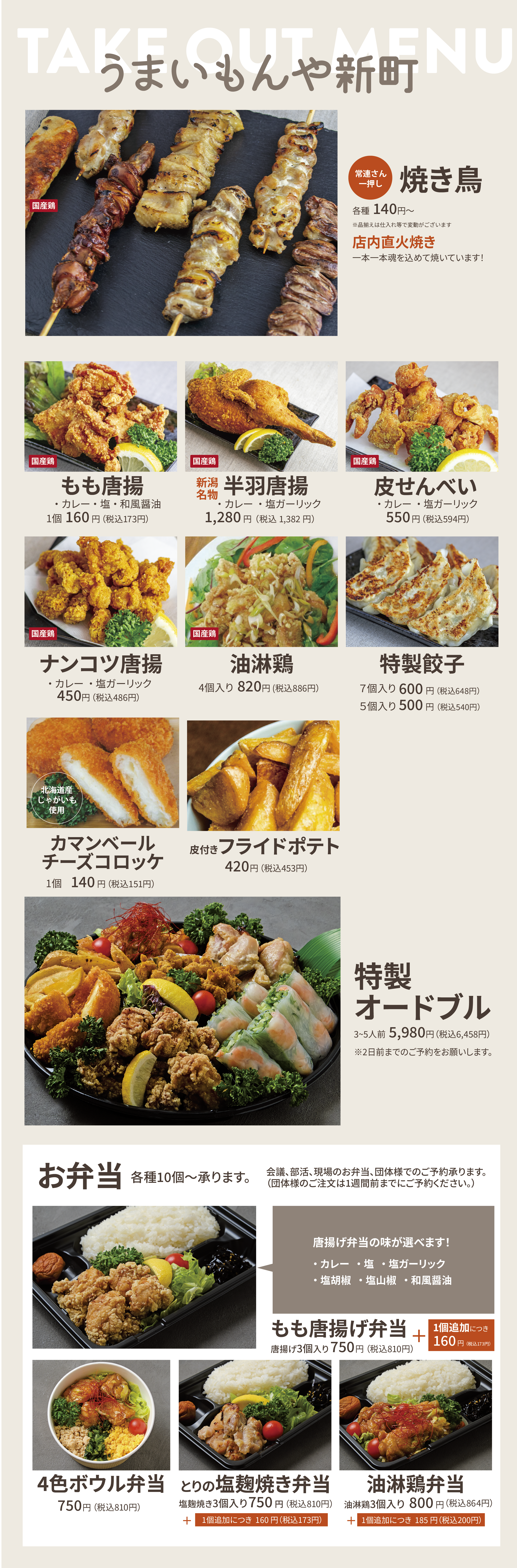 本格焼き鳥、半身唐揚げ、オードブル出来立てお持ち帰り専門店🥡[要予約] 営業時間 ▫️11:30〜19:00 ☎️電話予約 0254-53-8888 (週末は混み合う為前日予約必須です) 新潟県村上市新町1005-2 国道7号線沿い イオン村上東店すぐそば メニューはこちらから ↓ ↓ ↓ ↓
